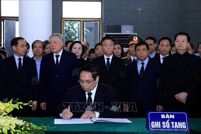 Thủ tướng Chính phủ Phạm Minh Chính viết sổ tang chia buồn cùng gia đình. Ảnh: TTXVN