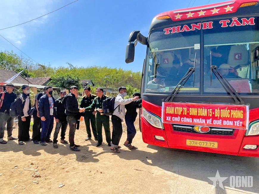 | Người lao động Đoàn Kinh tế - Quốc phòng 78 phấn khởi được về quê ăn Tết trên những chuyến xe đơn vị tổ chức. |