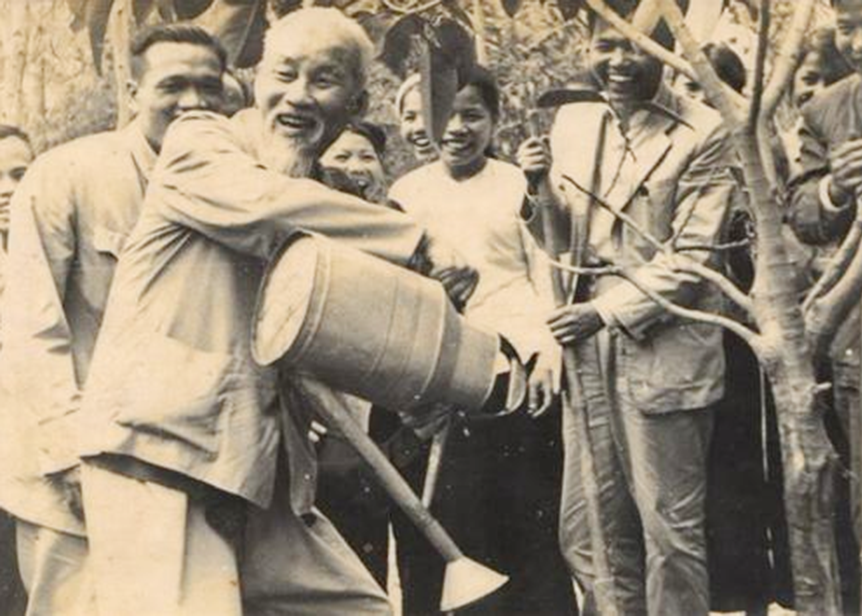 Bác Hồ trồng cây đa tại xã Vật Lại, Ba Vì, Hà Tây (nay là Hà Nội) ngày 16-2-1969. Ảnh: Bảo tàng Hồ Chí Minh.