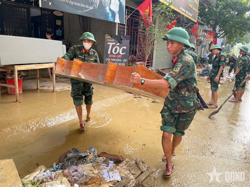| Bộ đội Trung đoàn 209, Sư đoàn 312, Quân đoàn 12 chung tay dọn dẹp các tuyến đường trung tâm tỉnh Thái Nguyên sau ngập lụt lịch sử, tháng 10-2025. Ảnh: VĂN HIẾU |