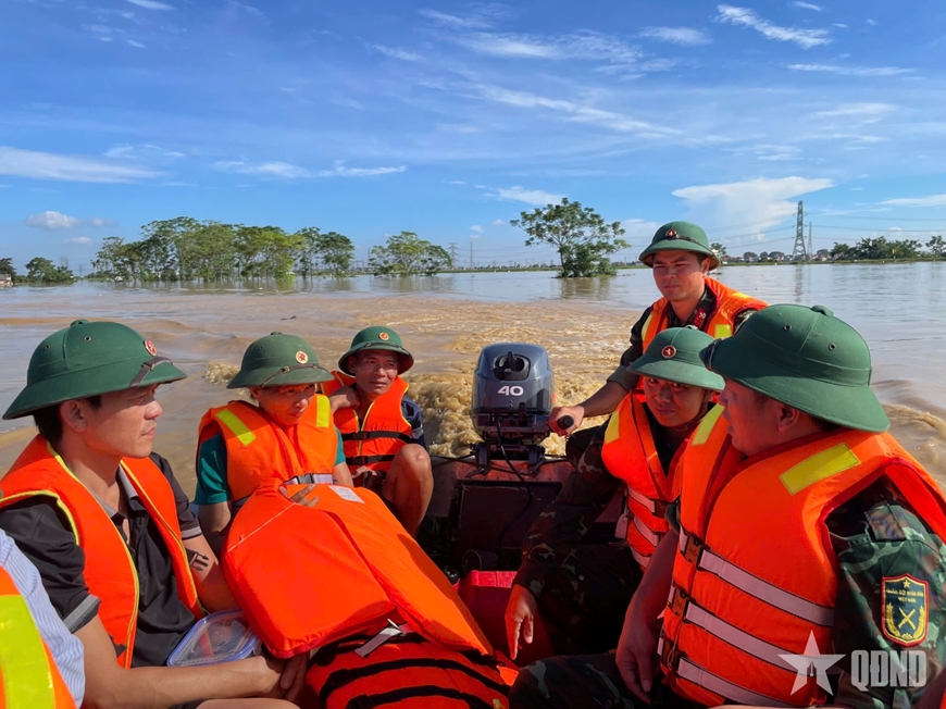 Bộ đội Trung đoàn 209, Sư đoàn 312, Quân đoàn 12 sơ tán bà con bị cô lập do ngập lụt lịch sử ở phường Trung Thành, tỉnh Thái Nguyên, tháng 10-2025. Ảnh: VĂN HIẾU