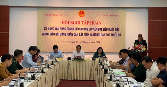 Với mục đích tạo điều kiện cho các ứng cử viên tiềm năng người dân tộc thiểu số tham gia ứng cử, trở thành đại biểu Quốc hội và đại biểu HĐND, Thường trực Hội đồng Dân tộc của Quốc hội mời các chuyên gia, những người có kinh nghiệm trong các cơ quan dân cử tham gia truyền đạt những kỹ năng và kiến thức cơ bản cho các đại biểu tham dự hội nghị. Chủ tịch Hội đồng Dân tộc của Quốc hội Hà Ngọc Chiến bày tỏ tin tưởng, khóa tâ%3ḅp huấn này sẽ góp phần giúp cho những người là người dân tộc thiểu số nắm được kiến thức và những kỹ năng cần thiết để tham gia vâ%3ḅn đô%3ḅng bầu cử mang lại kết quả tích cực, với tỷ lê%3ḅ trúng cử cao nhất trong kỳ bầu cử đại biểu Quốc hô%3ḅi và đại biểu HĐND sắp tới.