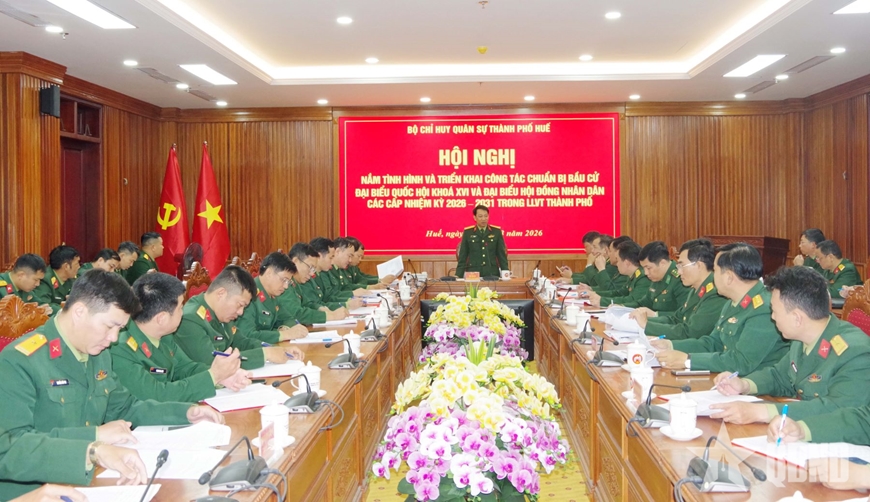 Ngày 9-3, Bộ chỉ huy Quân sự (CHQS) TP Huế tổ chức hội nghị nắm tình hình và triển khai công tác bầu cử đại biểu Quốc hội khóa XVI và đại biểu Hội đồng nhân dân (HĐND) các cấp nhiệm kỳ 2026 - 2031 trong LLVT thành phố. Đại tá Hà Văn Ái, Phó chính ủy Bộ CHQS TP Huế chủ trì hội nghị.