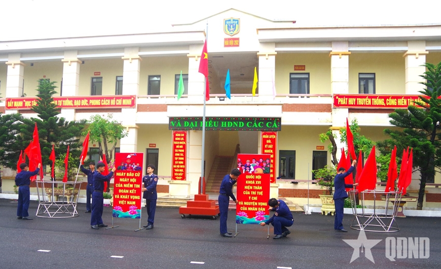 Hệ thống pano, áp phích tuyên truyền về bầu cử được Hải đội 202 bố trí, trưng bày trang trọng, nổi bật.