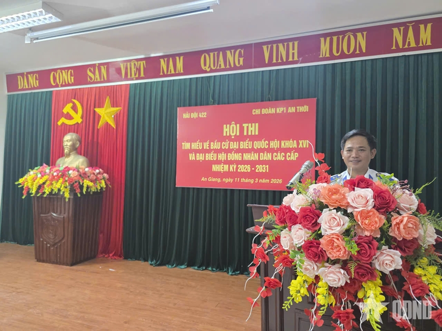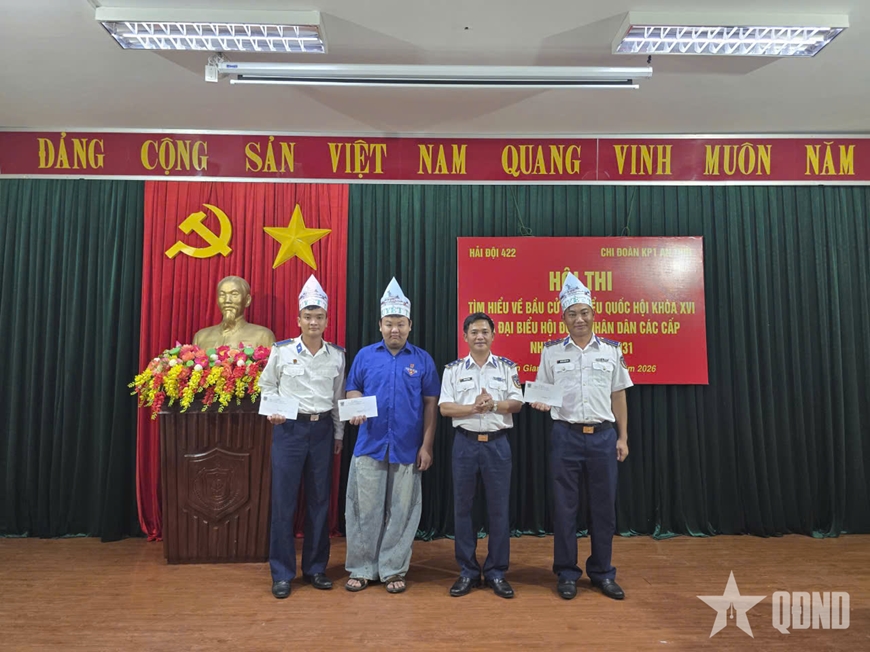 Trung tá Phan Tiến Tùng, Chính trị viên Hải đội 422 trao thưởng cho đội thi đạt giải Nhất trong Hội thi tìm hiểu về bầu cử đại biểu Quốc hội khóa XVI và đại biểu Hội đồng nhân dân các cấp nhiệm kỳ 2026 - 2031.