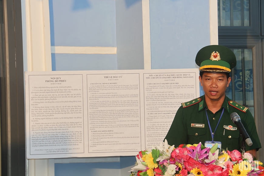| Trung tá Nguyễn Văn Qươn, Chính trị viên phó Đồn Biên phòng Hòn Chuối, Tổ trưởng Tổ bầu cử số 3 xã Sông Đốc phổ biến thể lệ bầu cử và nội quy phòng bỏ phiếu. |