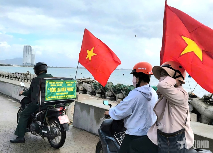 | Đồn Biên phòng Đông Hải tuyên truyền bầu cử bằng mô hình “Tiếng loa Biên phòng” tại khu vực cảng cá. |