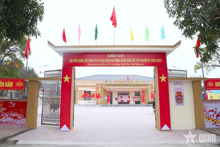 | Khu vực bỏ phiếu số 23, phường Vinh Phú, Nghệ An được trang trí rực rỡ, nghiêm trang. |
