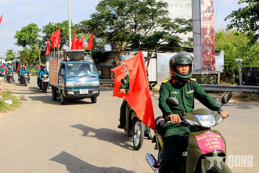 Các phương tiện mang theo cờ Tổ quốc, băng rôn, khẩu hiệu, kết hợp phát loa tuyên truyền, góp phần tạo không khí sôi nổi, lan tỏa tinh thần trách nhiệm của mỗi công dân hướng tới ngày hội lớn của toàn dân.