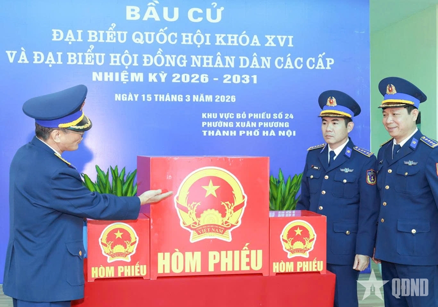 Đại tá Ngô Minh Tùng, Phó tham mưu trưởng Cảnh sát biển Việt Nam, Tổ trưởng Tổ bầu cử số 24 (đứng thứ hai, từ phải sang) kiểm tra hòm phiếu phục vụ bầu cử.