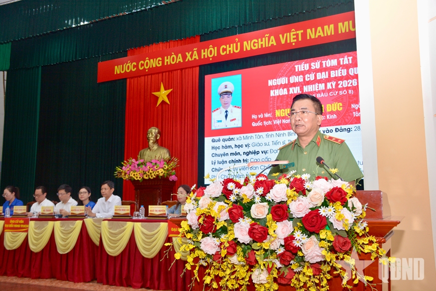 | Trung tướng Nguyễn Minh Đức, Phó chủ nhiệm Ủy ban Quốc phòng, An ninh và Đối ngoại của Quốc hội, ứng cử viên đại biểu Quốc hội khóa XVI phát biểu. |