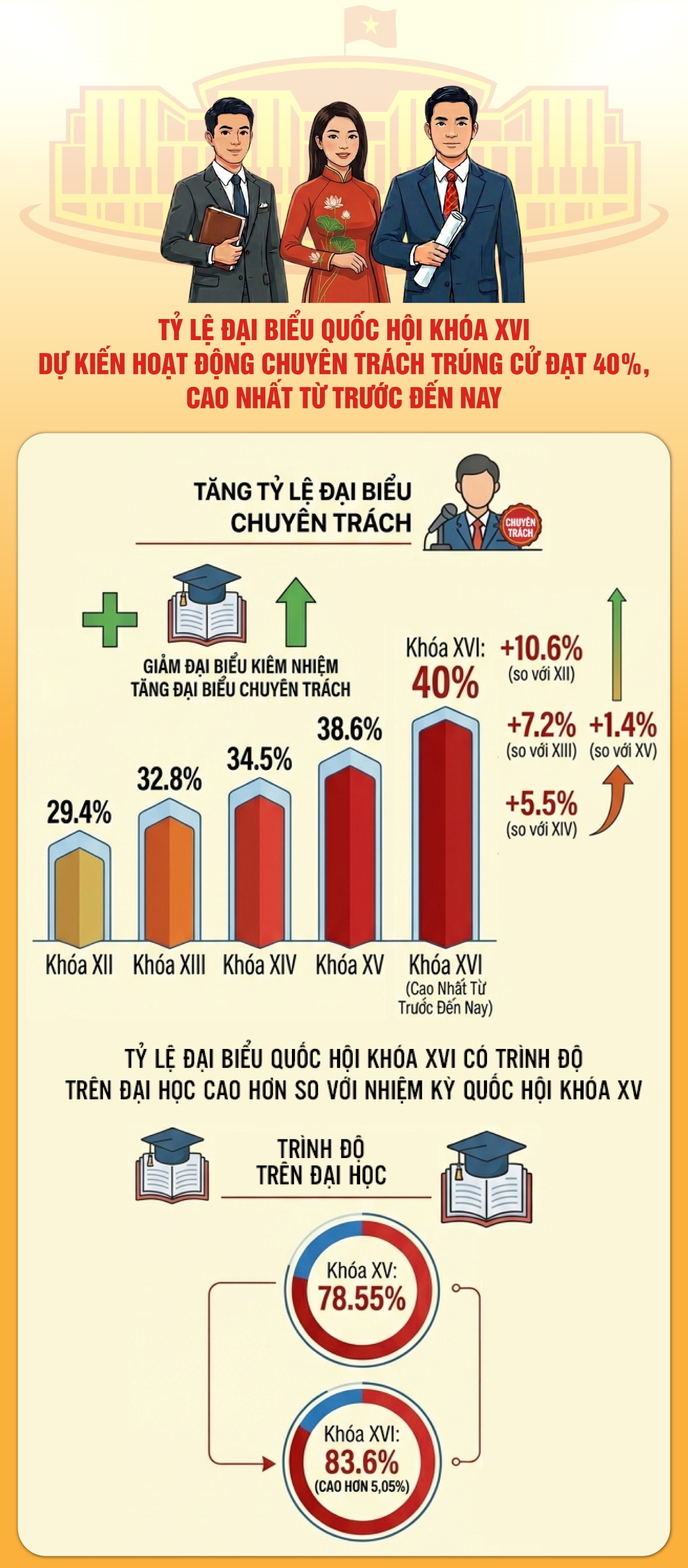 Với kết quả nêu trên cho thấy, cơ cấu thành phần đại biểu Quốc hội khóa XVI đã giảm đại biểu kiêm nhiệm làm việc trong các cơ quan hành pháp, tư pháp, tăng tỷ lệ đại biểu hoạt động chuyên trách. Tỷ lệ đại biểu Quốc hội khóa XVI có trình độ trên đại học đạt 83,6%, cao hơn so với nhiệm kỳ Quốc hội khóa XV (tỷ lệ 78,55%).