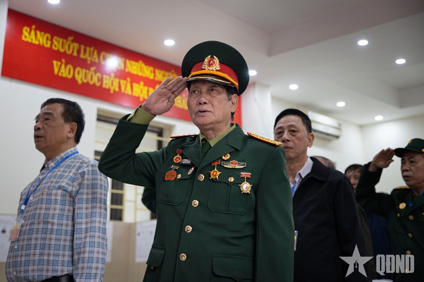 | Nghi lễ chào cờ trong ngày vận hành thử nghiệm quy trình bầu cử tại Khu vực bỏ phiếu số 22. |