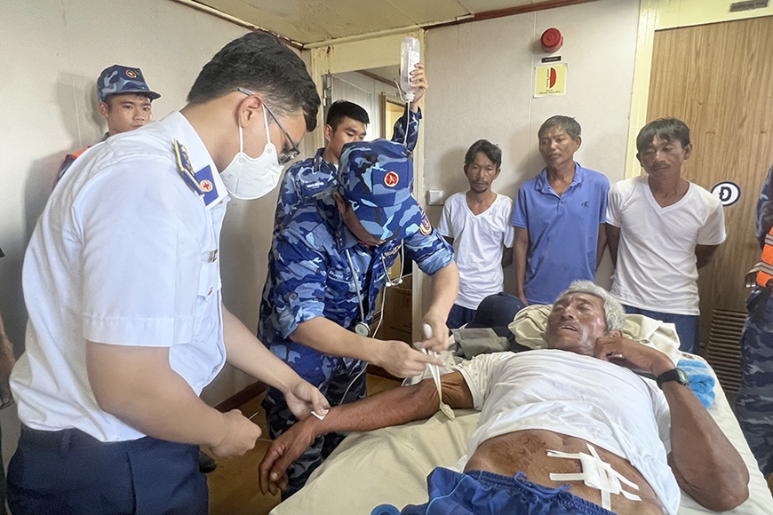 | Cán bộ, chiến sĩ Vùng Cảnh sát biển 2 chăm sóc y tế cho ngư dân bị tai nạn khi làm ăn trên biển. |