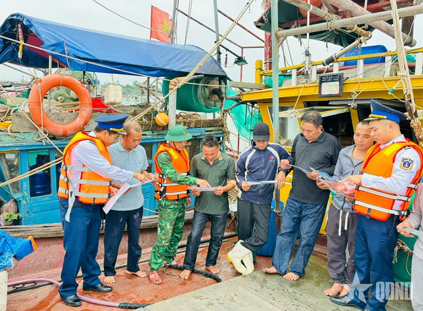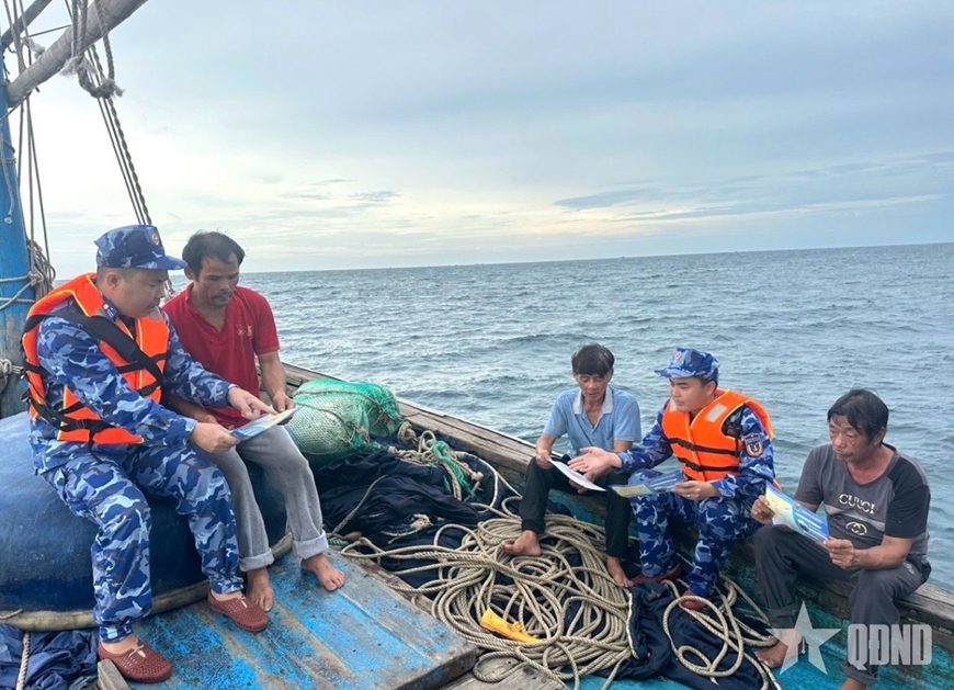 | Tổ công tác của Hải đoàn 11 phối hợp với Đồn Biên phòng Đoàn Xá tổ chức tuyên truyền chống khai thác IUU cho ngư dân. |