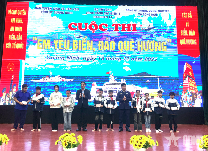 Trung tá Tống Duy Thuần, Phó chính ủy Hải đoàn 11 cùng lãnh đạo địa phương trao giải cho các em học sinh xuất sắc trong cuộc thi vẽ tranh.