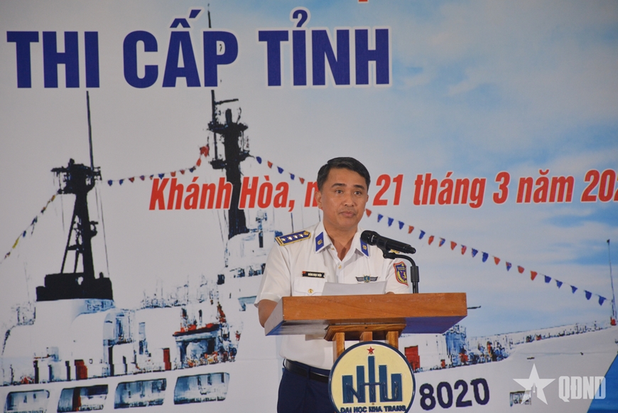 Đại tá Hoàng Ngọc Thiện, Chính ủy Hải đoàn 32 phát biểu tại cuộc thi.