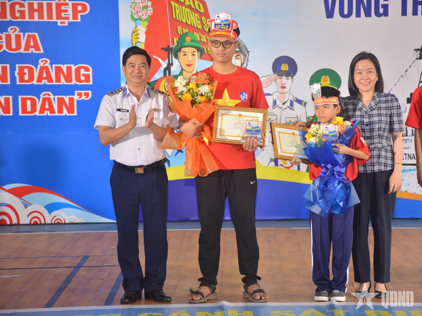 | Ban tổ chức trao giải nhất tặng em Nguyễn Huy Hoàng Nam (ở giữa), Trường THCS Võ Thị Sáu, phường Nam Nha Trang. |