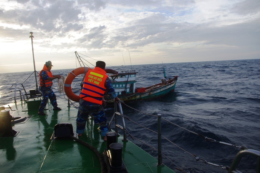 | Lực lượng Cảnh sát biển tiếp cận, ứng cứu tàu của ngư dân bị sự cố khi làm ăn trên biển. |
