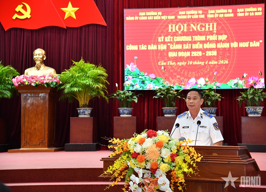 | Thiếu tướng Nguyễn Văn Dũng, Bí thư Đảng ủy, Chính ủy Bộ tư lệnh Vùng Cảnh sát biển 4 trình bày kết quả từ đợt ký kết với các địa phương thực hiện chương trình "Cảnh sát biển đồng hành với ngư dân" trước khi sáp nhập. |