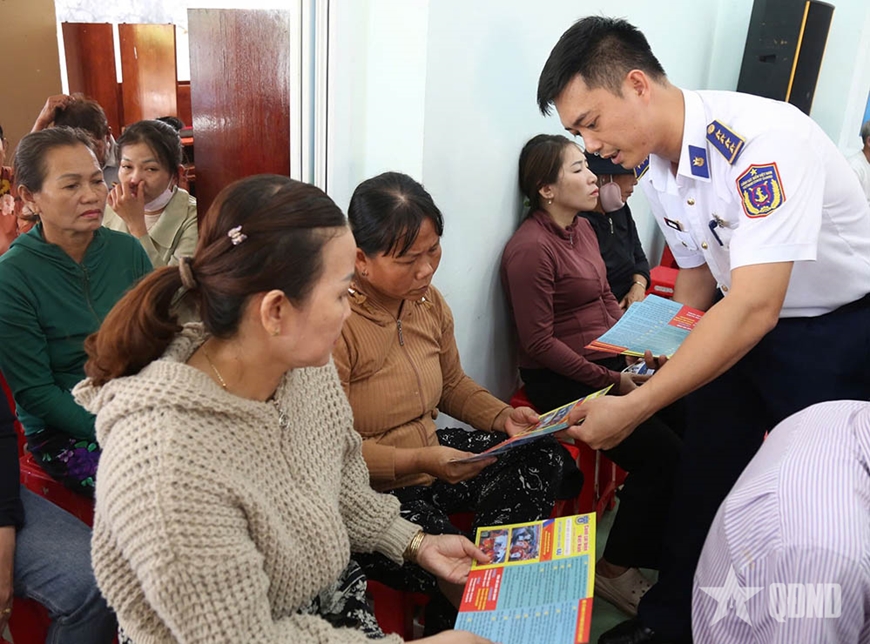 | Phát tài liệu tuyên truyền pháp luật cho ngư dân. |