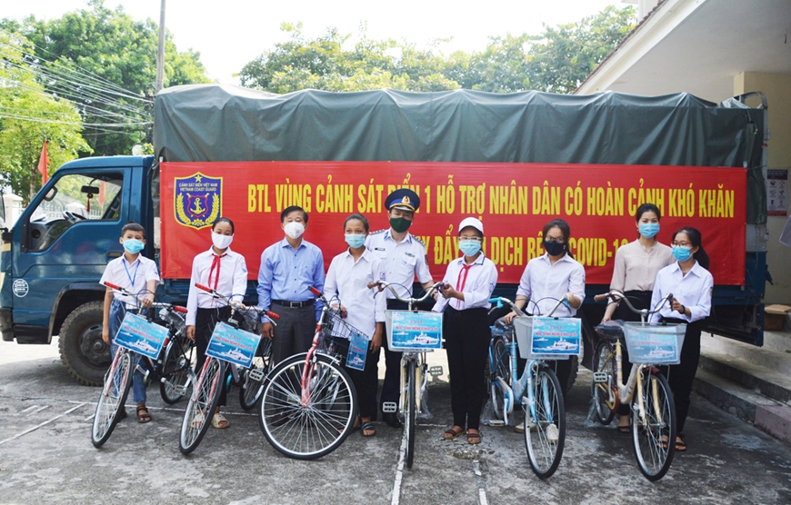 Mì ăn liền, gạo, nước mắm, dầu ăn, mì chính... những phần quà tuy không đắt tiền nhưng có ý nghĩa thiết thực đối với các gia đình chính sách, nạn nhân chất độc da cam có hoàn cảnh khó khăn do ảnh hưởng của dịch Covid-19. Những chiếc xe đạp còn thơm mùi sơn được cán bộ, chiến sĩ BTL Vùng CSB 1 trao tặng tận tay các cháu học sinh có hoàn cảnh khó khăn, tiếp thêm nghị lực để các cháu an tâm tới trường. Cầm những món quà trên tay, ông Nguyễn Đức Cường ở thôn Văn Úc, xã Hùng Thắng, huyện Tiên Lãng, xúc động chia sẻ: “Được lực lượng CSB tặng quà, chúng tôi rất cảm ơn. Trong lúc khó khăn này, sự động viên của các anh đã tiếp thêm động lực để gia đình cố gắng phấn đấu trong lao động, sản xuất, để con cháu yên tâm vươn khơi bám biển, cùng cả nước vượt qua đại dịch”.