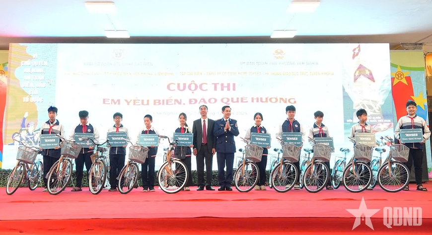 | Thủ trưởng Bộ Tham mưu Cảnh sát biển Việt Nam và đại diện chính quyền địa phương trao xe đạp tặng học sinh vượt khó học giỏi. |