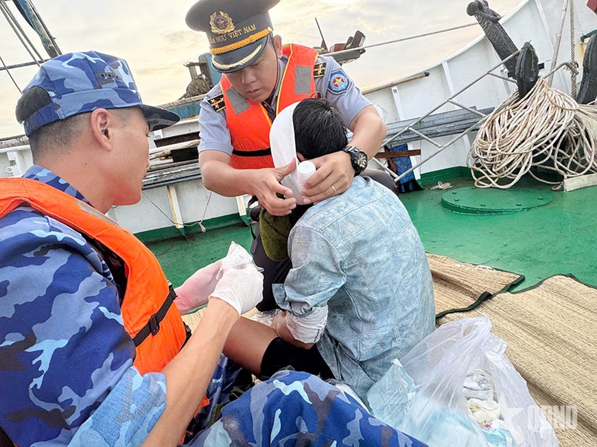 Nhân viên y tế tàu KN 201 sát khuẩn, băng bó vết thương cho nạn nhân. |