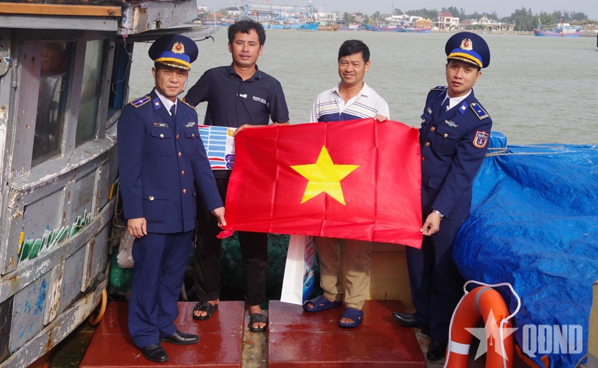 Đại diện Phòng Pháp luật trao tặng quà và cờ Tổ quốc cho tàu cá đang neo đậu tại Cảng cá Cửa Việt, tỉnh Quảng Trị.