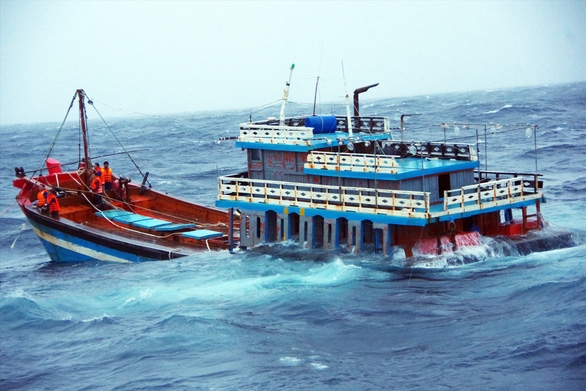 | Tàu CSB 8002 tiếp cận, ứng cứu tàu cá QNg 95058TS trong bão số 5 vừa qua. |