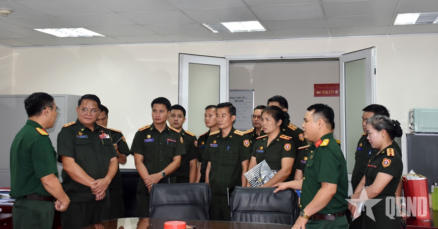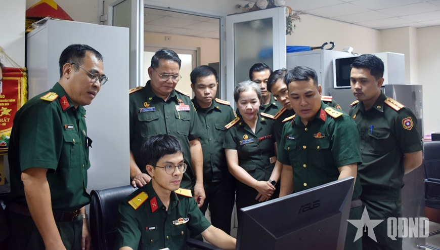 | Đoàn cán bộ Báo Quân đội nhân dân Lào tham quan, tìm hiểu tại Ban tiếng Lào (Phòng biên tập Báo Quân đội nhân dân Điện tử). |