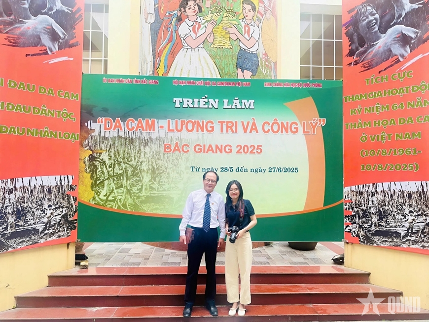 Báo Quân đội nhân dân đã tạo điều kiện để tác giả (bên phải) tác nghiệp tại triển lãm “Da cam - Lương tri và Công lý” tại tỉnh Bắc Giang (nay là Bắc Ninh).