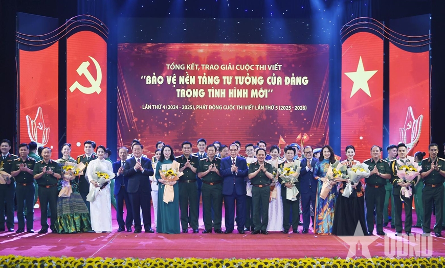 Đại biểu tặng hoa nghệ sĩ, diễn viên tham gia Tổng kết và trao giải Cuộc thi viết “Bảo vệ nền tảng tư tưởng của Đảng trong tình hình mới” lần thứ 4 do Báo Quân đội nhân dân và Hội Nhà báo Việt Nam phối hợp tổ chức, tháng 5-2025. Ảnh: TUẤN HUY |