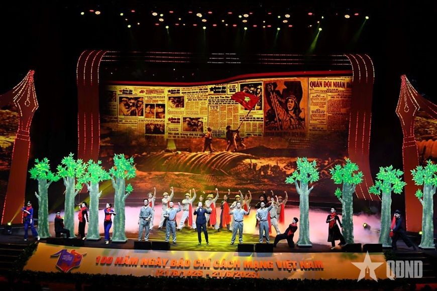 Hình ảnh Báo Quân đội nhân dân xuất bản tại Mặt trận Điện Biên Phủ xuất hiện tại Lễ kỷ niệm 100 năm Ngày Báo chí cách mạng Việt Nam, tháng 6-2025. Ảnh: TUẤN HUY |