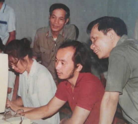 Tổng biên tập Phan Khắc Hải (ngoài cùng, bên phải) làm việc với bộ phận vi tính, Nhà in của Báo QĐND. Ảnh do tác giả cung cấp