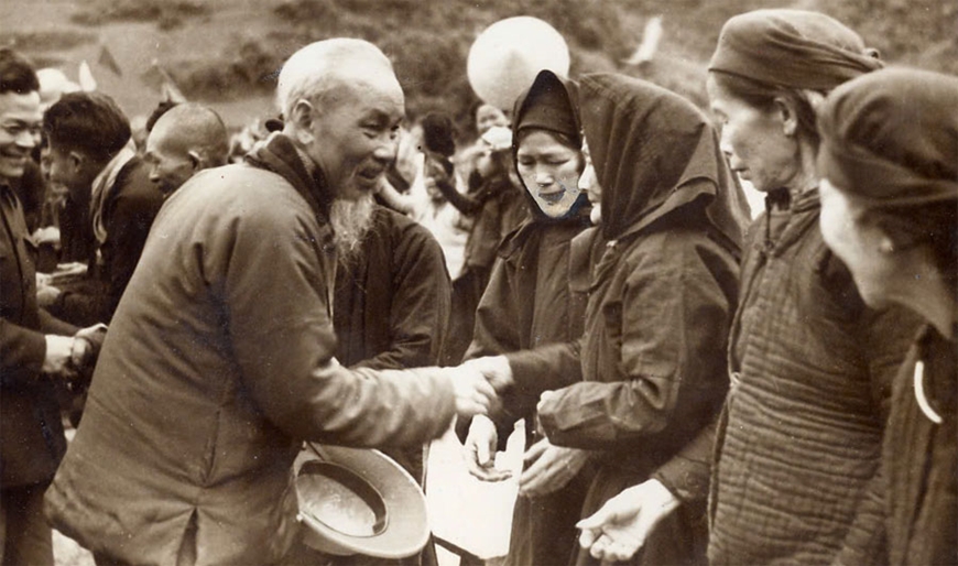| Chủ tịch Hồ Chí Minh thăm hỏi đồng bào Pác Bó, Cao Bằng, tháng 2-1961. Ảnh tư liệu |