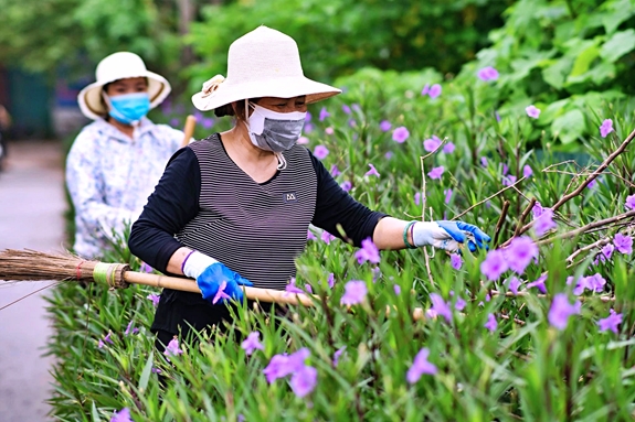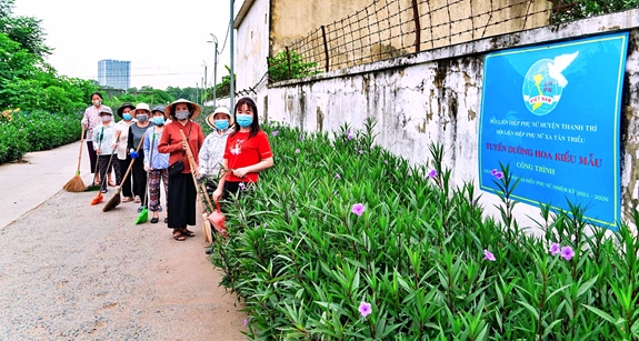 Phụ nữ huyện Thanh Trì đẩy mạnh học và làm theo Bác từ những việc nhỏ, thiết thực. (Trong ảnh: Phụ nữ xã Tân Triều tham gia chỉnh trang, chăm sóc tuyến đường hoa kiểu mẫu gắn với tuyên truyền trật tự văn minh đô thị). Ảnh: CHU THẢO