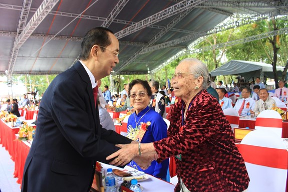 Chủ tịch nước Trần Đại Quang ân cần thăm hỏi Bà mẹ Việt Nam anh hùng Lê Thị Tải ở phường Bình Khánh, TP Long Xuyên, tỉnh An Giang (tháng 8-2018). |