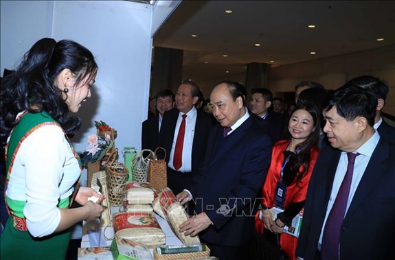 Trong ảnh: Thủ tướng Nguyễn Xuân Phúc thăm khu vực trưng bày sản phẩm của các doanh nghiệp tại hội nghị. Ảnh: TTXVN