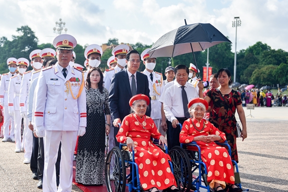 | Cán bộ, chiến sĩ Bộ tư lệnh Bảo vệ Lăng Chủ tịch Hồ Chí Minh đón các Bà Mẹ Việt Nam Anh hùng ra thăm Thủ đô Hà Nội và vào Lăng viếng Bác. Ảnh: HỒNG SÁNG. |