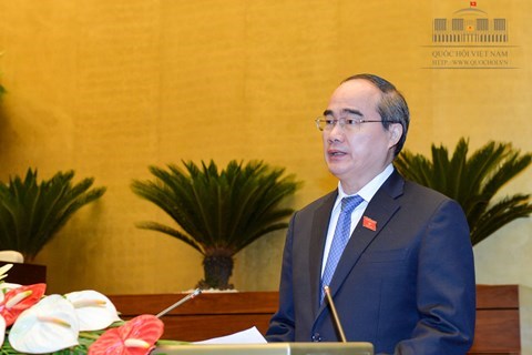 Chủ tịch Ủy ban Trung ương Mặt trận Tổ quốc Việt Nam Nguyễn Thiện Nhân trình bày Báo cáo tổng hợp ý kiến, kiến nghị của cử tri và nhân dân. Ảnh: Đình Nam