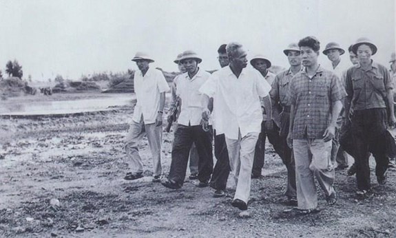 Đồng chí Phạm Văn Đồng và đồng chí Đỗ Mười chỉ đạo chống lụt tại Hải Dương, tháng 8-1971. Ảnh: VOV.