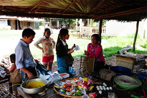 Nhân viên Metfone (thương hiệu Viettel tại Cam-pu-chia) giới thiệu dịch vụ viễn thông cho người dân tại đất nước Chùa Tháp. Ảnh: LINH NGA