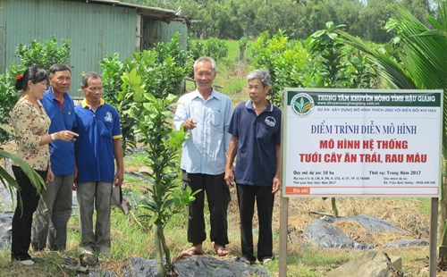 Bí thư Đảng ủy xã Vị Thắng (Vị Thủy, Hậu Giang) Đoàn Thị Thùy Hương (ngoài cùng, bên trái) trao đổi với nông dân về trồng cây ăn trái cho năng suất, chất lượng cao. Ảnh: ANH THẢO