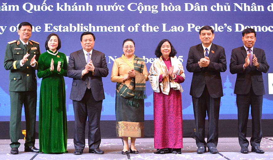 | Lãnh đạo Đảng, Nhà nước Việt Nam cùng Đại sứ Khamphao Ernthavanh và các đại biểu dự chiêu đãi kỷ niệm 50 năm Quốc khánh Lào do Đại sứ quán Lào tại Hà Nội tổ chức ngày 26-11. Ảnh: VŨ HOÀNG |