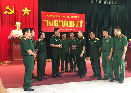 Đại tá Hà Mạnh Tường, Phó tổng biên tập Báo Quân đội nhân dân và Đại tá Trần Quang Trung, Phó chính ủy Trường Sĩ quan Chính trị trao đổi với cán bộ, học viên Trường Sĩ quan Chính trị tại lễ phát động hưởng ứng Cuộc thi ngày 9-8-2016. ẢNH: NGUYỄN ANH