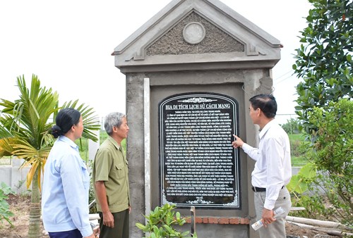 Cán bộ xã Liên Minh và thôn Trung Nghĩa bên bia di tích nơi ra đời chi bộ Đảng đầu tiên của huyện Vụ Bản (tại thôn Trung Nghĩa, xã Liên Minh).