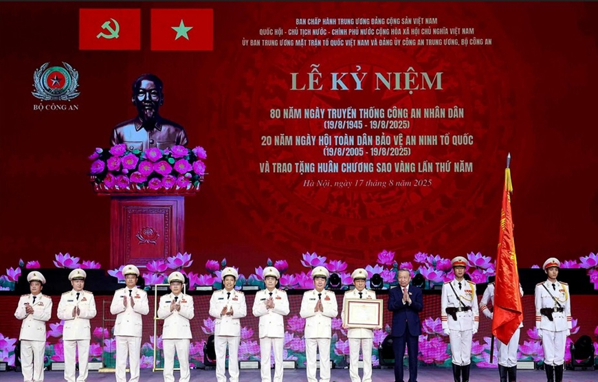 | Tổng Bí thư Tô Lâm trao Huân chương Sao vàng lần thứ 5 tặng lực lượng Công an nhân dân (ngày 17-8-2025). |