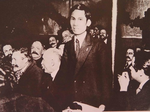 Nguyễn Ái Quốc phát biểu tại Đại hội lần thứ 18 Đảng Xã hội Pháp (tháng 12-1920), ủng hộ Luận cương của Lê-nin về vấn đề dân tộc và vấn đề thuộc địa. Ảnh tư liệu.