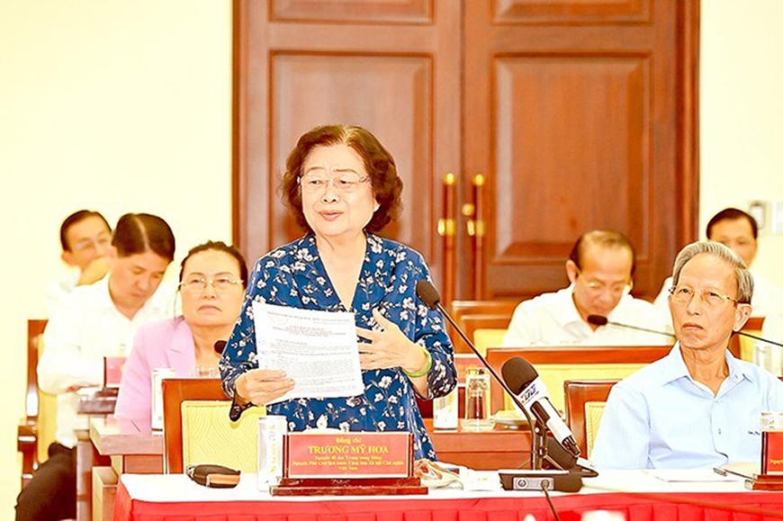 Nguyên Phó chủ tịch nước Trương Mỹ Hoa góp ý xây dựng văn kiện Đại hội đại biểu Đảng bộ TP Hồ Chí Minh lần thứ I. Ảnh: ĐỖ DŨNG |